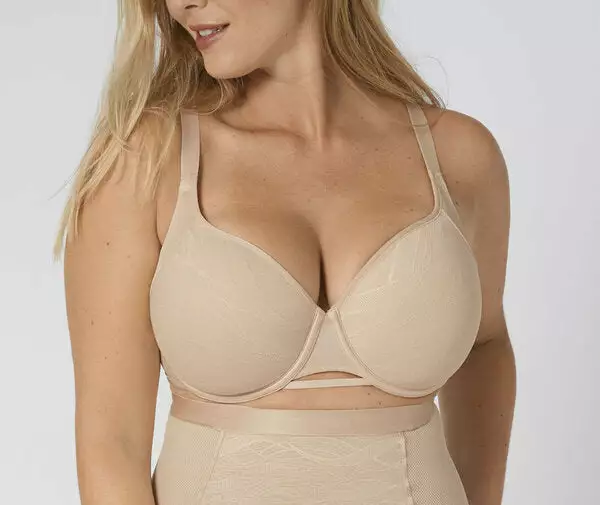 A t shirt bra with innovative spacer cup technology for super light and breathable padding. Features a rounded shape, and sateen trims on the side for a smoothing effect.