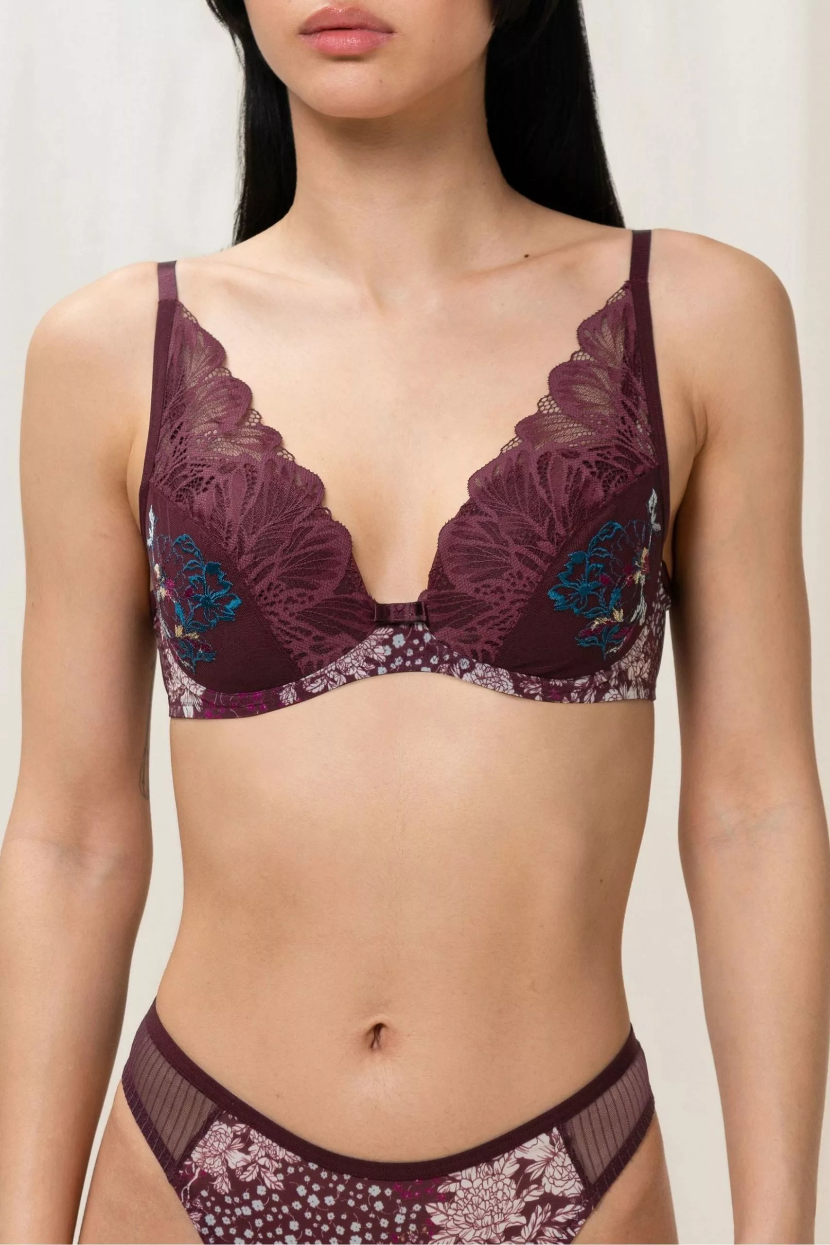 We designed the lavish spotlight series with a combination of beautiful embroidery and delicate lace. This padded bra creates a feminine shape and offers you optimum support. Padded wired bra, plunge style for seductive look. Underbust function lining for bigger cups.