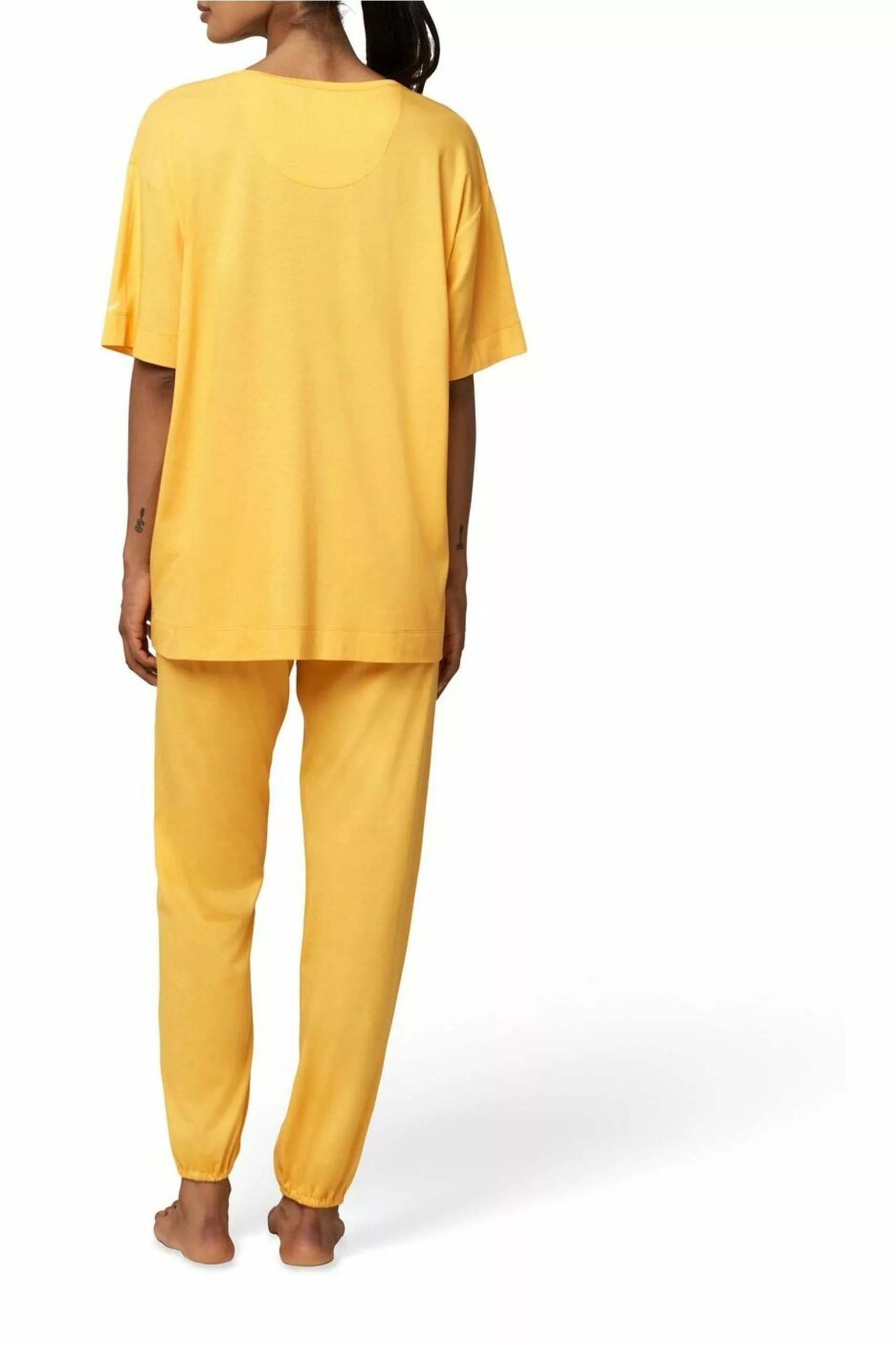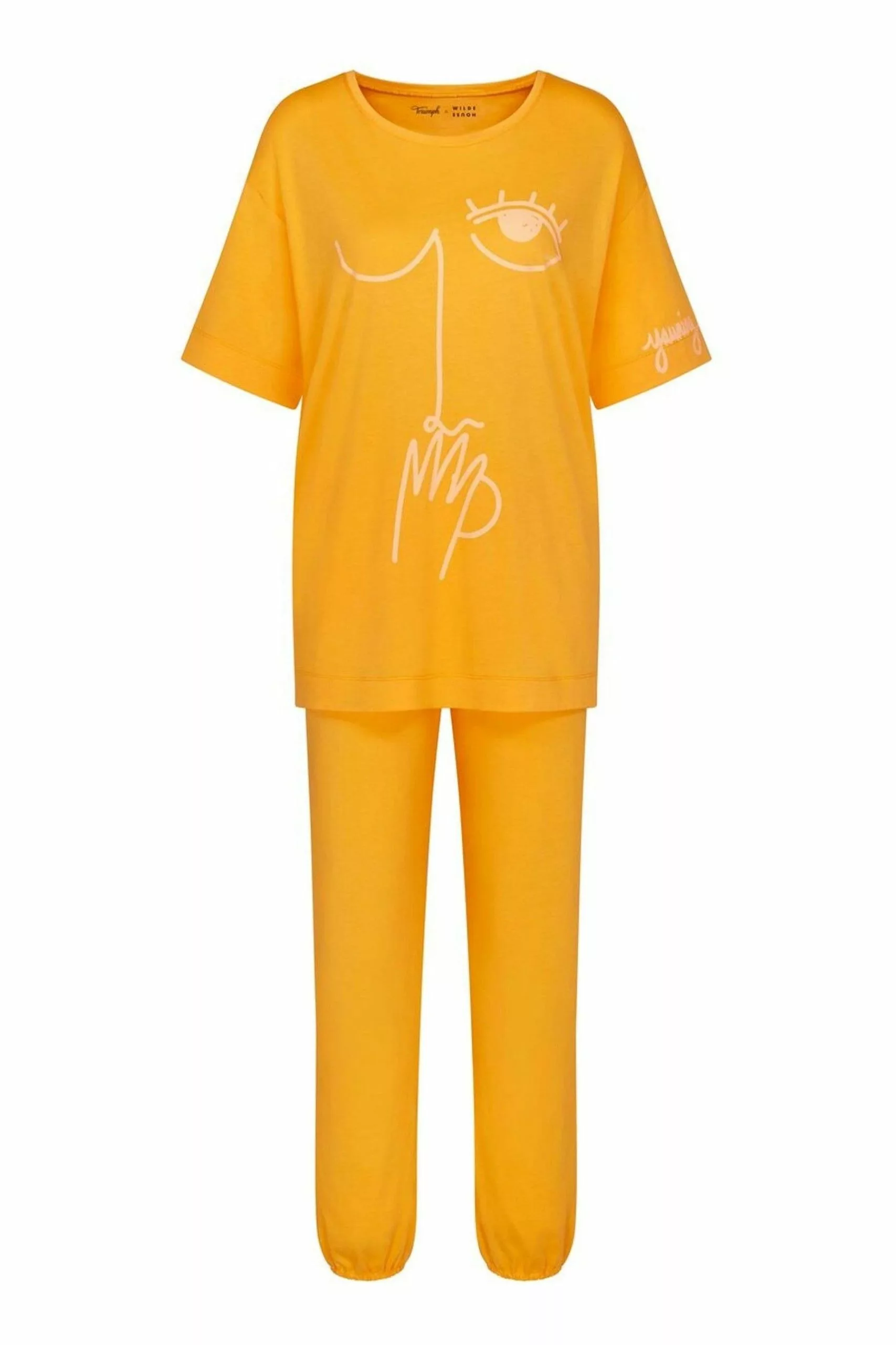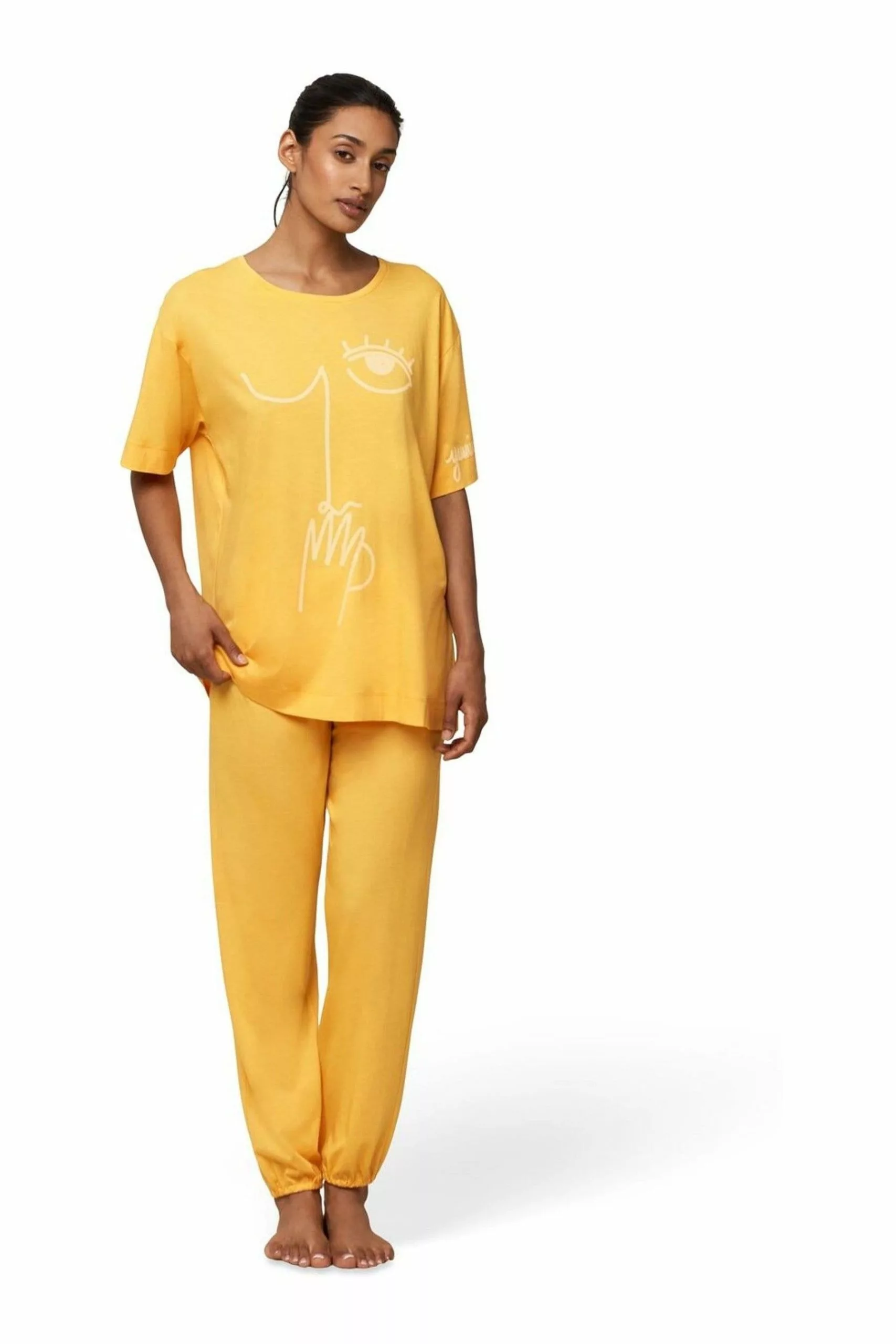 Long trouser pyjamas featuring wide cuffs and hems and slightly gathered elastic hem.
