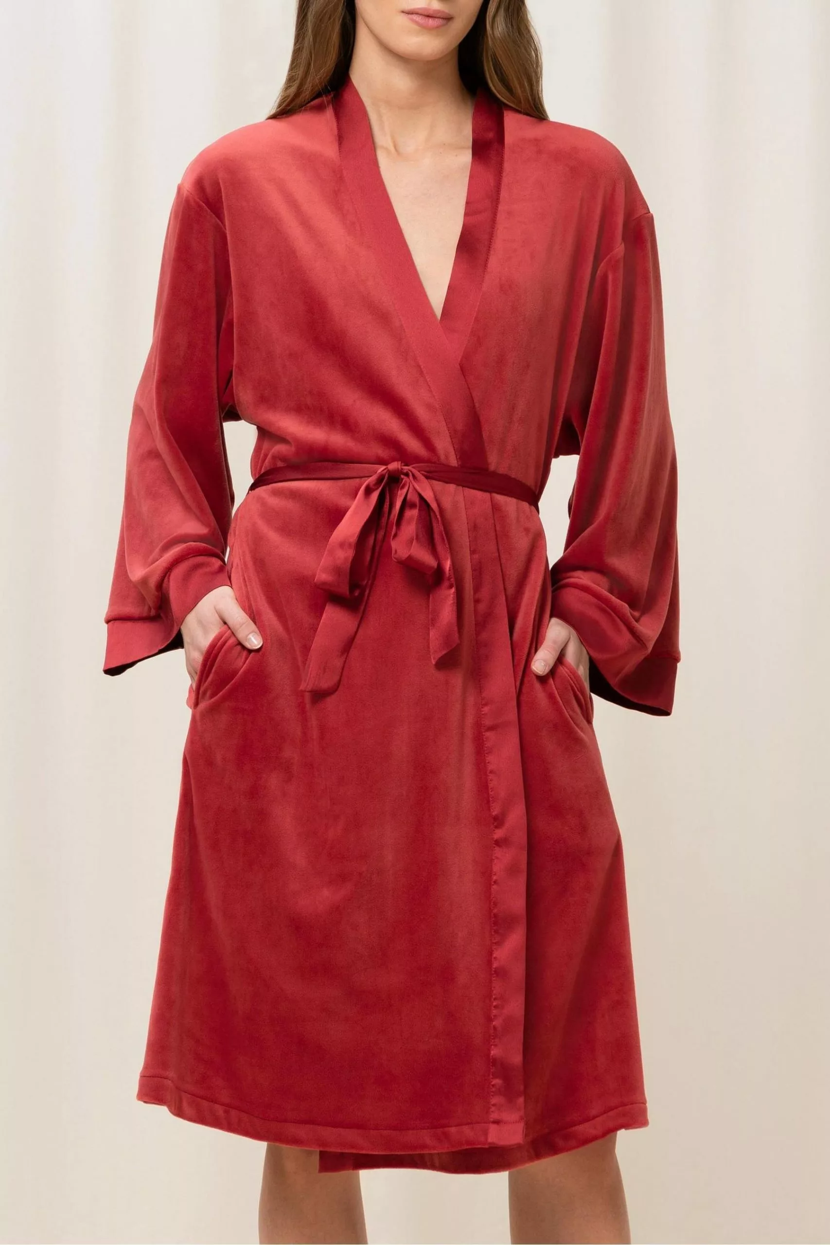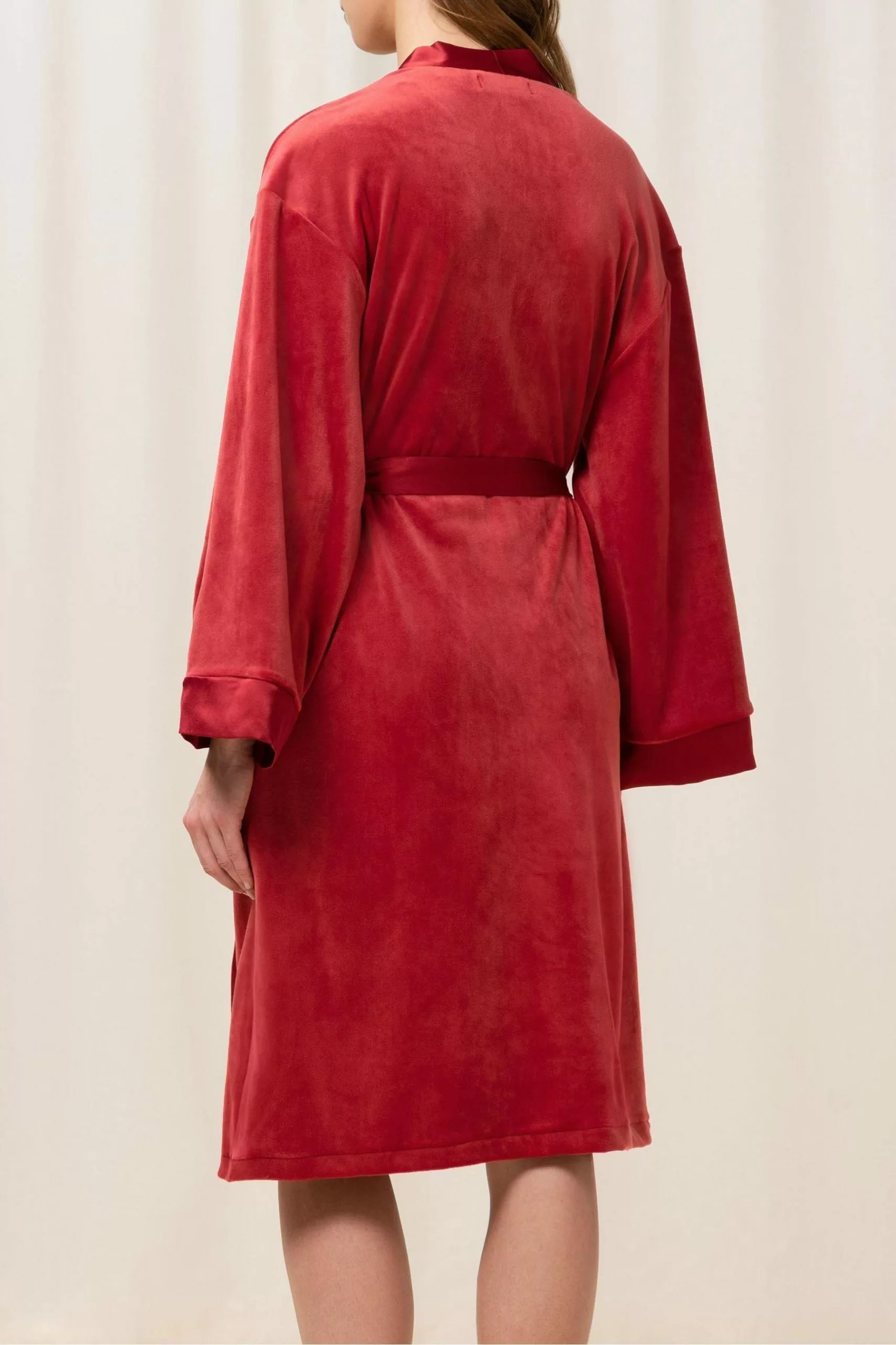 The velour robe is made from soft fabric that will provide you with warmth and cosiness all season. Feminine design with sateen tie-belt and side seam pockets.